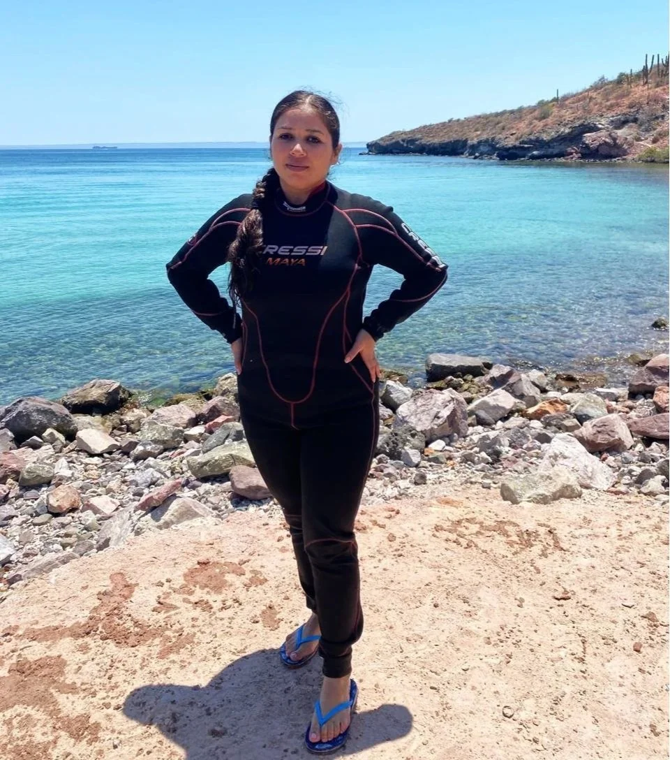 “Mi motivación para ser buza monitora nació al descubrir la belleza del ecosistema marino en Cabo Pulmo”, comparte Vanessa. “Quiero explorar, compartir y contribuir al cuidado del mar en mi comunidad.”